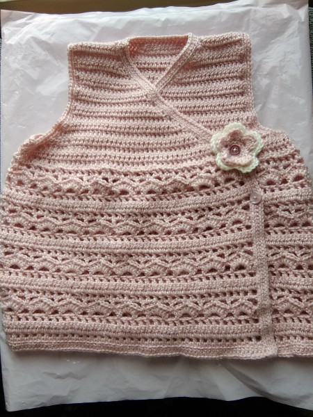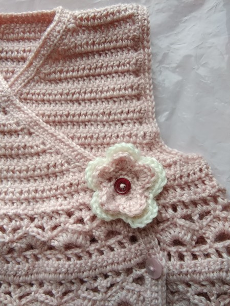 流行り?の、くすみカラーでロングベストを作成 コサージュ中心にボタン穴があります