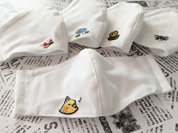 | サラシに刺繍してマスクを作りました。 介護職をしている友人家族に送るので、入所者さんたちの楽しみの1つになればいいなと思って色々な刺繍をさしました。 マスクの裏にはフィルターを交換できるようにポケットになっていて、上部にはワイヤーが入れられるようになっています。 |