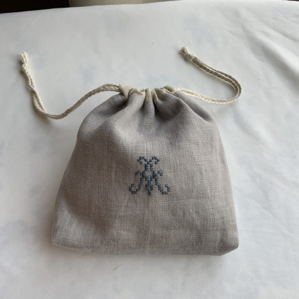 アルファベットの古い図案が素敵で、麻生地にステッチしました。