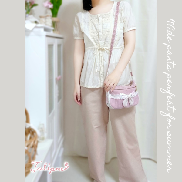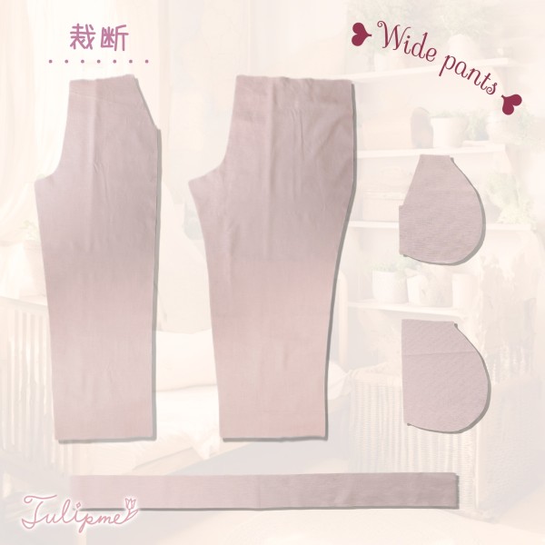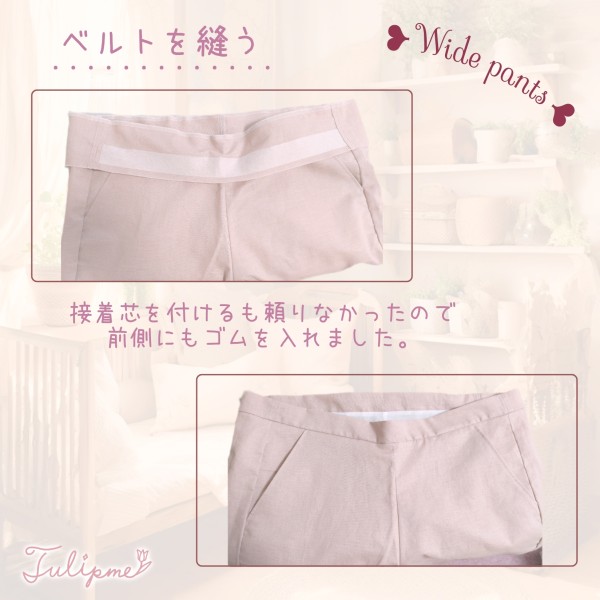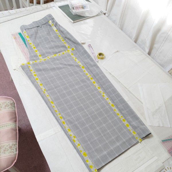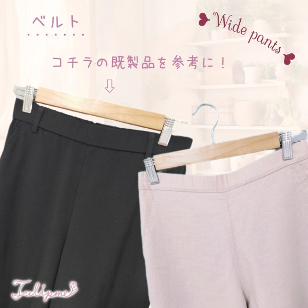 ウエスト(ベルト)は既製品を、裾幅と丈の長さは以前の作品を参考にしました。