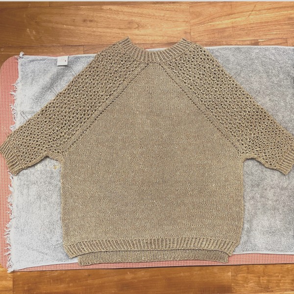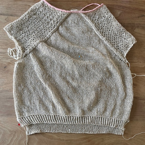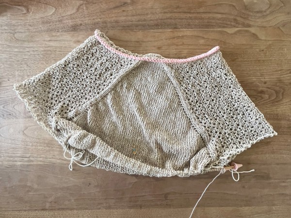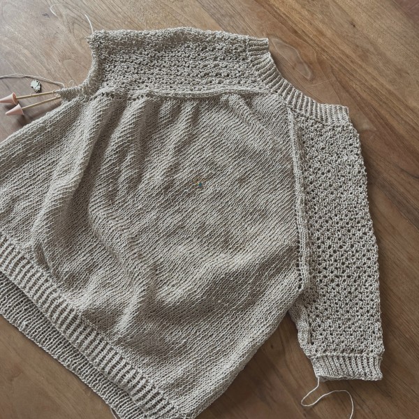 襟と左袖ができました。袖の長さは私の好みでレシピよりだいぶ短め。