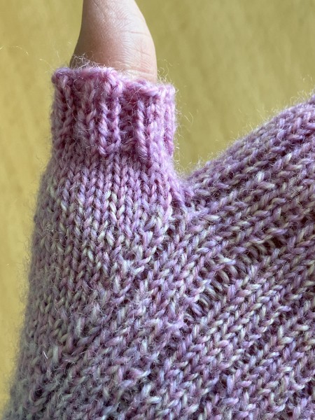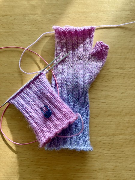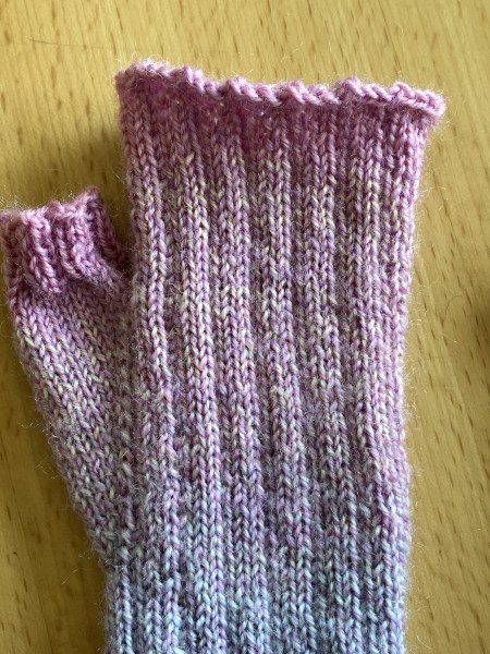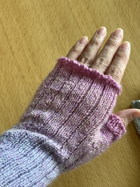 | 暖かくなってきたけど、段染め糸でハンドウォーマーを編みます ゆくれあさんの動画を参考に、表3裏1のゴム編みで作りました 親指の目を拾うところも、何とか無事に編めて、初めての手袋(指なし)完成です |