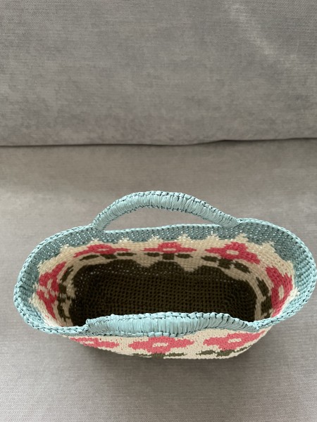 | 「おしゃれバッグと夏の帽子」から花模様のバッグを 持ち手はコブラステッチでアレンジしました。 アンダリヤは手が痛くなるし、肩もこるのでもうやらないと毎年おもうのだけれど 季節になるとやっぱり可愛いのであみたくなる。 |