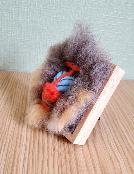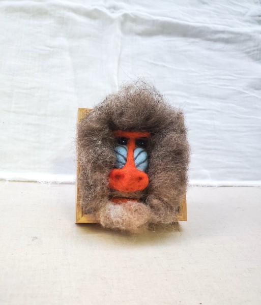 額から大きくはみ出してるマンドリル、しかし額内に納めて表現が難しく、毛の色も一度刺したのがいまいちだったので、黄味の羊毛を他の色と混ぜて刺し変えました