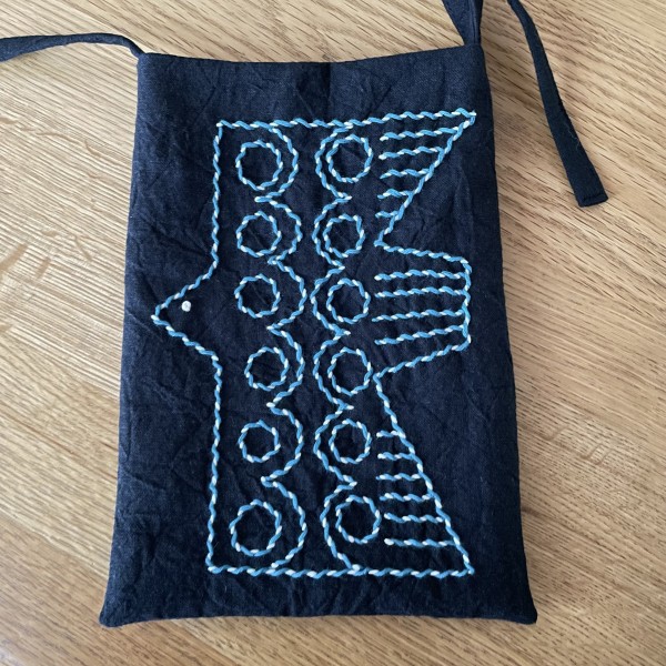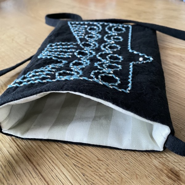 | 堀川波さんの『刺し子ステッチで楽しむ服と小物』の、ミニバッグを縫いました。スマホと鍵を入れて近所を歩くのにちょうど良いです。 本の中で可愛いと思っていた鳥の刺繍に挑戦!初めてのステッチ方法で大きな絵柄だったのに、思ったよりもサクサク進められて楽しかったです。 今回、初めて「こぎん糸」という糸を使いましたが、太くて色も鮮やかで、とても気に入りました。 |