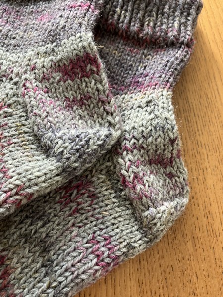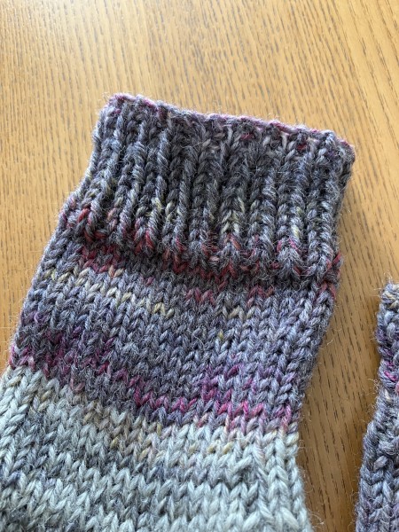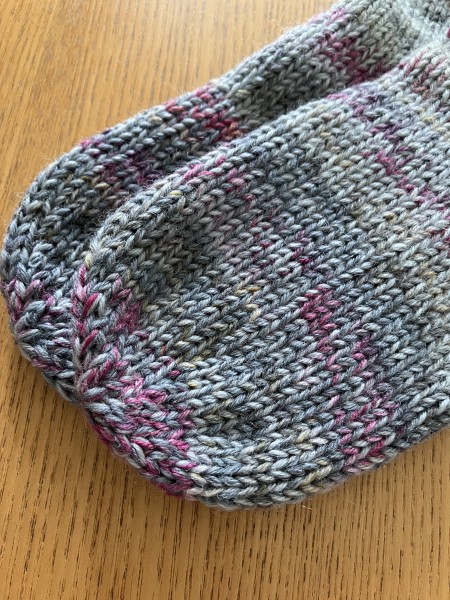グレー系のソックヤーンをベースに、並太や中細の糸を引き揃えて厚手の靴下を編みました