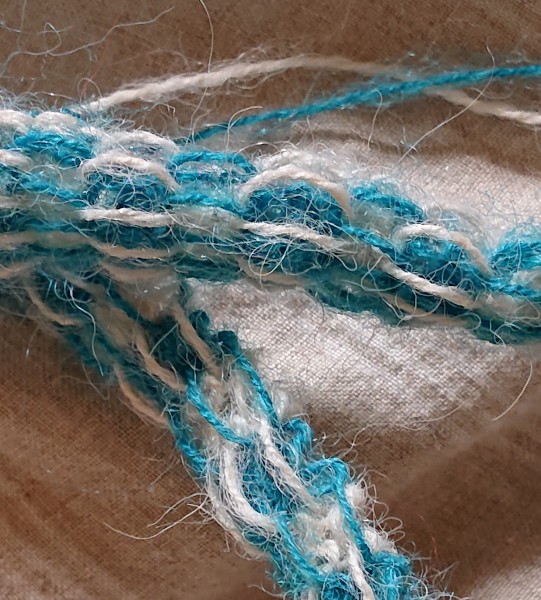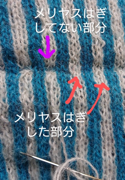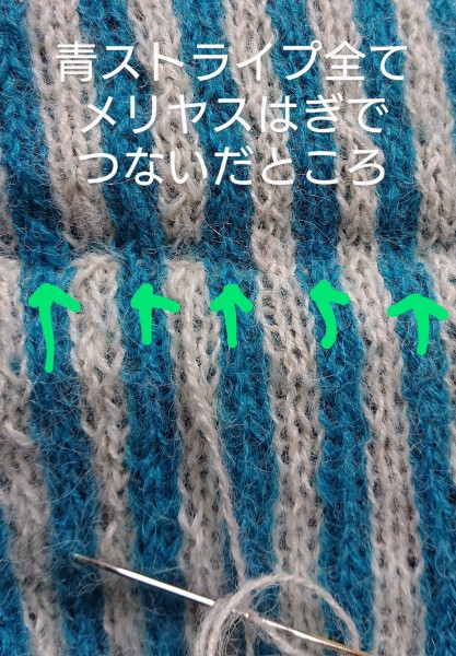 いろいろ試した結果、一旦両端を伏せ止めをしてから白糸部分を一周、青糸部分を一周それぞれメリヤスはぎをしたら、繋ぎ目が目立たなくなりました。