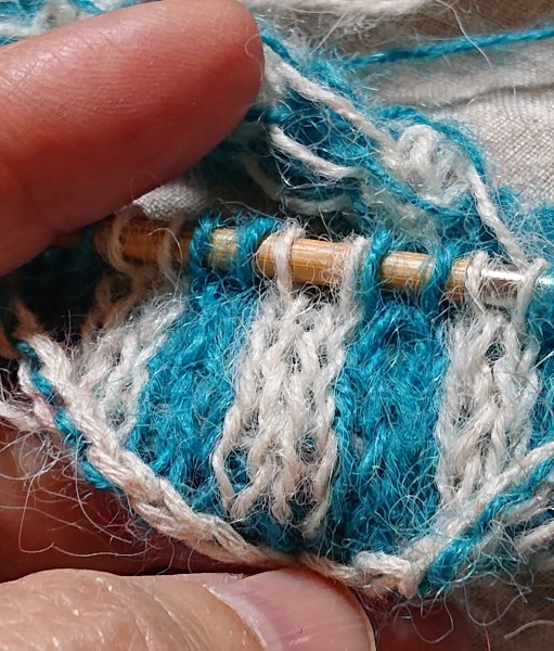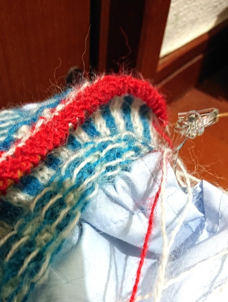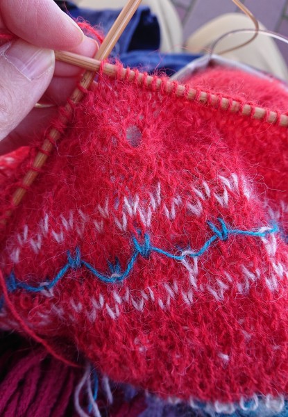 せっかくの綺麗な色糸なので、三色使ったクリスマスっぽい編み込みを計画しました。棒で編めるのかなと心配となる細糸でしたが、マジックループで隙間が延びるストレス、緩みがちな一段目のストレスを乗り越えたら、ちゃんと編み地が出来てきました。揺るんだ糸も、不思議と5~6段目ぐらいで気にならなくなりました。始めは丸まってしまうのは、仕方ない、これも気にせず前に進みます。