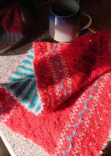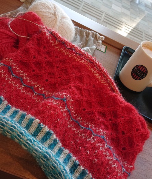 格子模様エリアに突入しました。なんか、模様が見えないな、でもクリスマスまでには仕上げたいからな、糸が細いせいかな、などとモヤモヤしつつ進めてましたが、間違いに気付き、赤エリアをほどきました。それからは、いままでの、矛盾点が解消されて格子模様が浮かび上がってきました。編み物の醍醐味ってこの、難所と思えた部分を攻略できた瞬間の爽快感だなと思います。