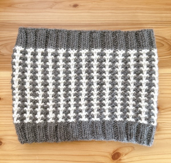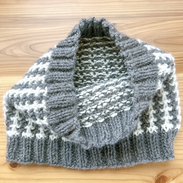 コケシ先生のネックウォーマーです。初心者向けと聞き作ってみました。表編み、裏編み、すべり目からなる模様編みが楽しめました♪