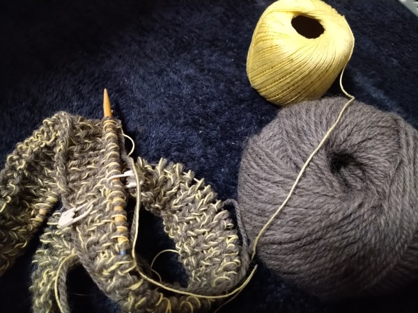 ドリームのわーくWORKS 純毛並太のグレーとダイソーのリサイクルレース糸 ベビーイエローを引き揃え
