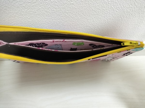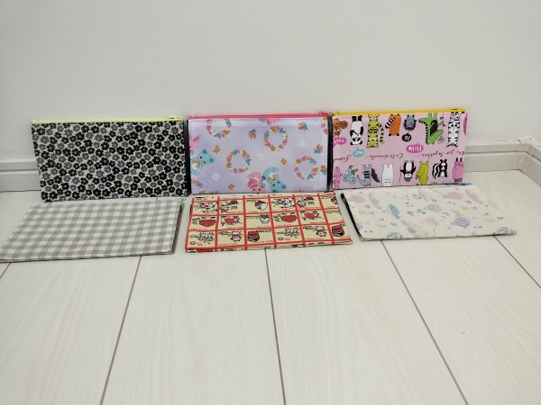 ペタンコポーチを作りました。中に仕切りがあるので、ちょっとしたお財布代わりや通帳入れ等に使えそうです。接着芯をつけたら端が硬くて縫いにくかったですが、その分しっかりしています。