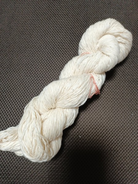 | タクリで紡いだコットン糸をベストカラーで染めました。 10gずつ紡いでラップ芯に一旦巻き、また10g紡いだら糸の先を繋げていく方法で1つのかせにしました。 紡ぎに5日、撚り止め・清錬・染めで2日ほど。 52gで約180mになりました。 編み物に使うために2本を撚り合わせて双糸にしています。 |