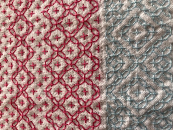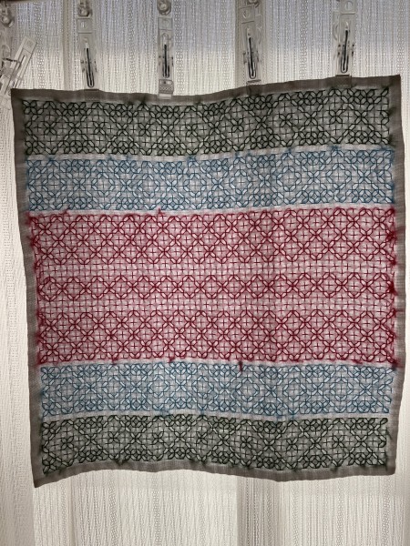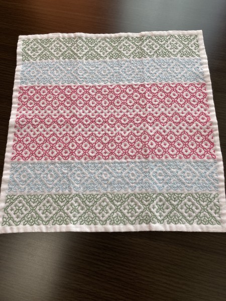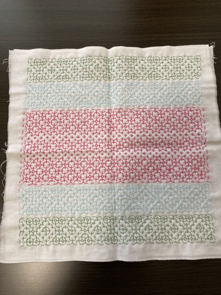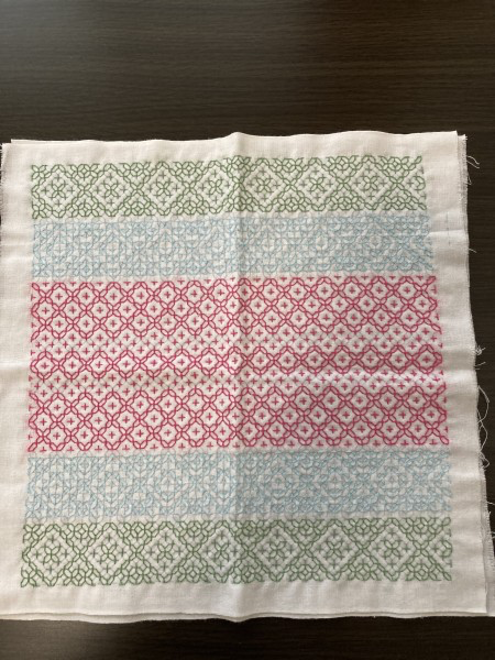 | 刺し子本の「刺し子デザイン帖」のなかの十字花刺しアレンジです。さらしはオリムパスの十字花刺しふきんを使いました。 糸端は固結びで始末しています。今回のように寄せ模様の時は、まず中心のピンクを完成させ、水色、緑と刺しています。 光に透けると、ピンク糸の結び目もわかってしまいますが、透かさなければあまり目立たないかなと思っています。 |