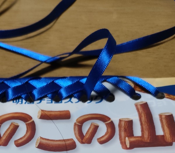 お菓子の外袋が可愛いので縁取りをリボンで編みポーチにしてみました。
