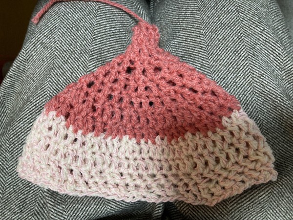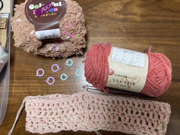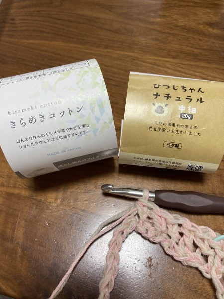 はじめは、きらめきコットンのピンクだけで編み始めようとしたら