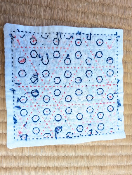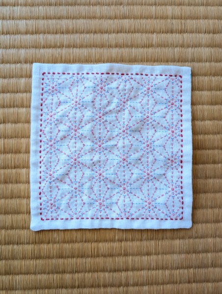 | セリアの刺し子「一目唐花亀甲」です。間違いすぎて裏がぐちゃぐちゃですが、表は可愛いです。 | |
