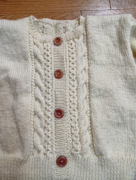 | アラン模様のカーディガンです。 毛糸ピエロさんの無料編み図を使用。 楽しく編めたけど思ったより模様が控えめだったので次はもっとアランアランしたやつ編みたいです(笑)。 編み図では袖口から斜めに増やしていく編み方でしたが私はゆったりした袖が好きなのでまっすぐ編みにしました。 |
