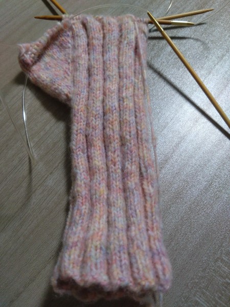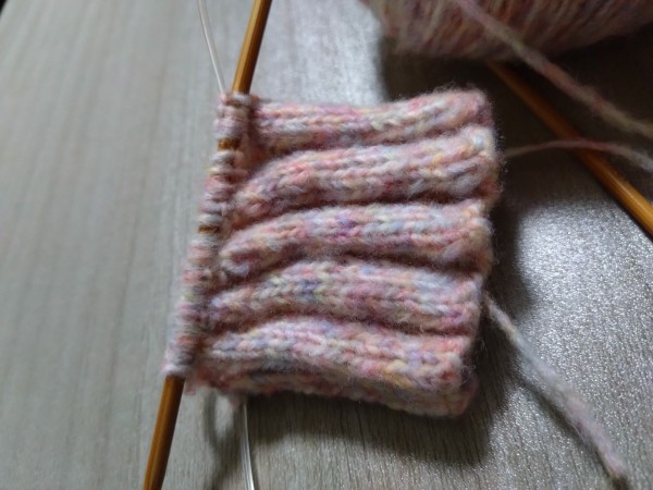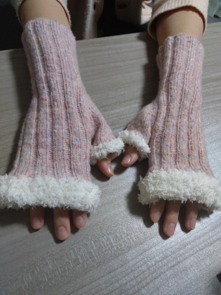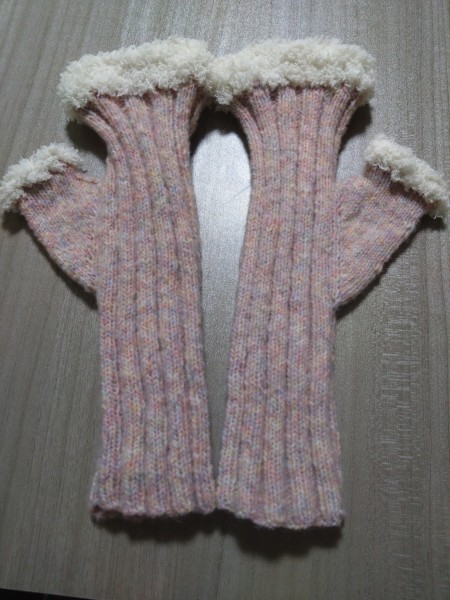 親指が寒かったので、親指の第一関節まで、メリアス編みして、モコモコファーをつけてみた