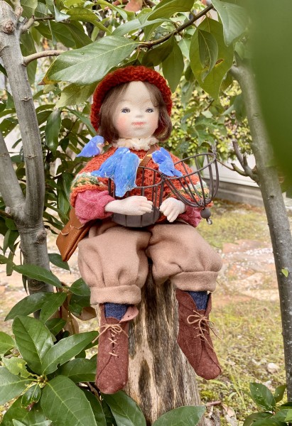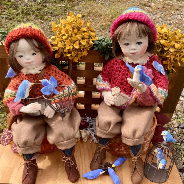 創作固定ポーズ人形。お揃いのニットとバックを身につけた姉妹。ニット 粘土 革 を駆使して表現しています。