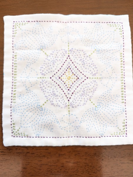 とにかく細かいので、刺し子糸は使わずに、刺繍糸2本取りで刺すことにしました。まずは枠を紫で刺しました。