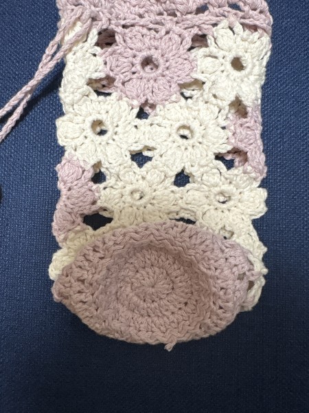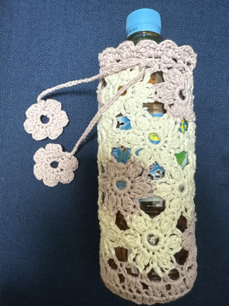 あまり糸でペットボトルホルダーを作りました。針の号数を大きくしたので、少しゆるめになりました。