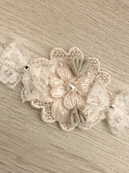 レースのパーツを中心としたベビーヘアバンドです。