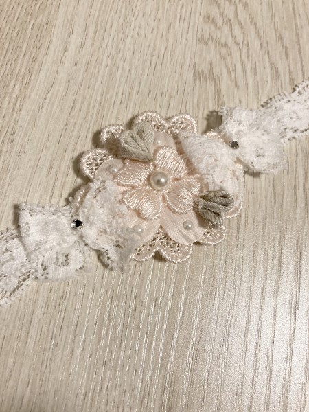 少ない材料で見映えよくいかに仕上げるかを考え、ヘアバンド部分のストレッチレースでリボンを可愛らしさをアップしてみました。