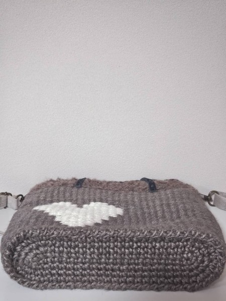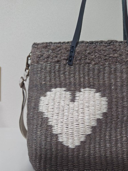 | 麻ひもの輪織レッスンで、ハートの模様織り2wayバッグを作りました。初めての模様織りでしたが、 先生に教わり可愛らしいバッグに仕上がりました。 バッグの口部分は毛糸と麻ひもの2本取りで織り、内袋はチェック柄にしました。 |