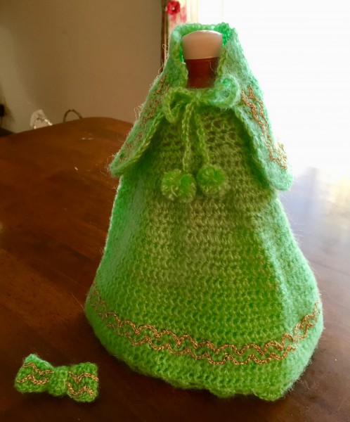 余っていたモヘアの毛糸で、娘のお人形のドレスとリボンの髪飾りを作った。ノースリーブのドレスとお揃いのケープ。