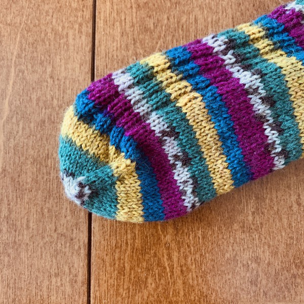模様編みに挑戦したけど、納得いかずに全部ほどいてからの再挑戦。 無難なリブ編みでかかと終わった所。 片足終わった。可愛い。