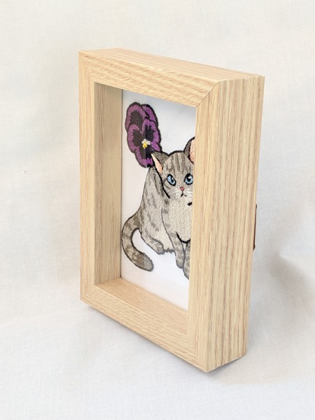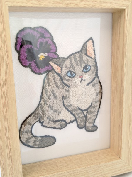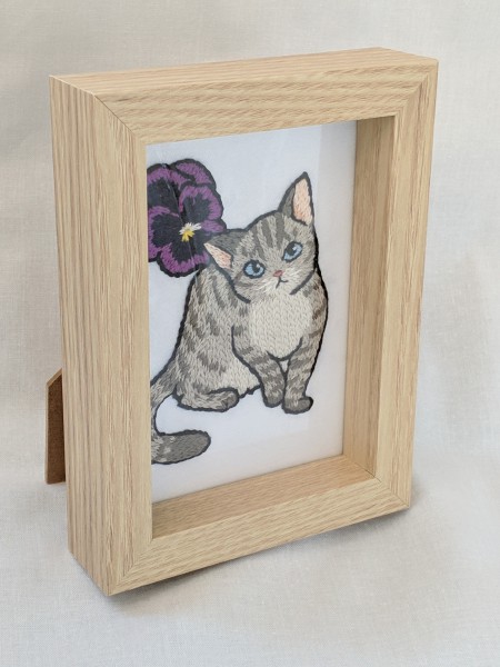 猫の柄を悩んだ末にサバトラに。 パンジーが紫だからかなりシックな感じになるかな。