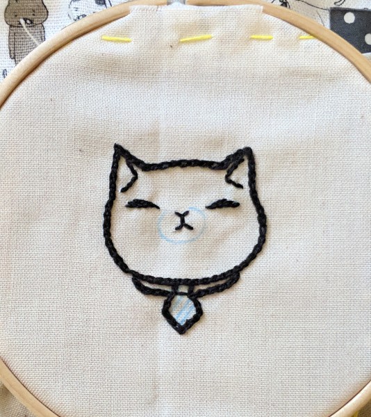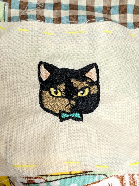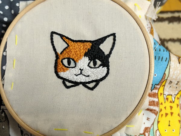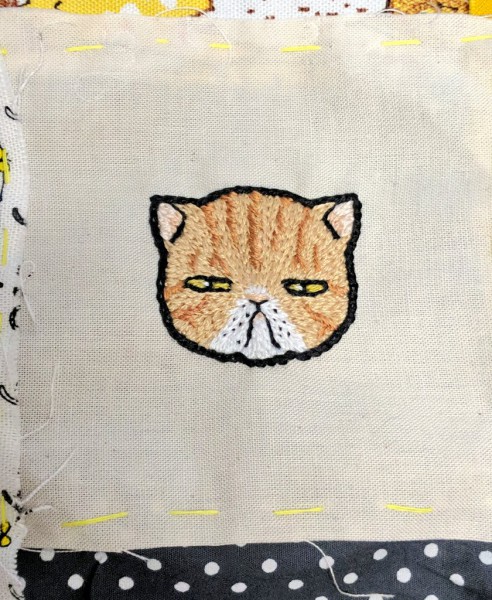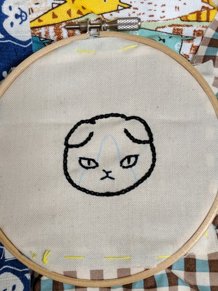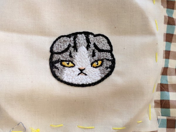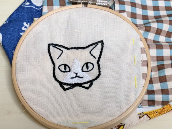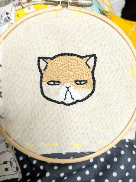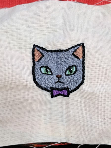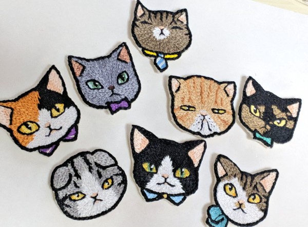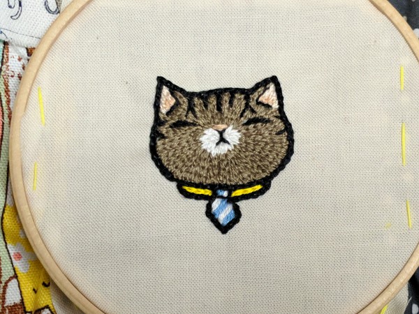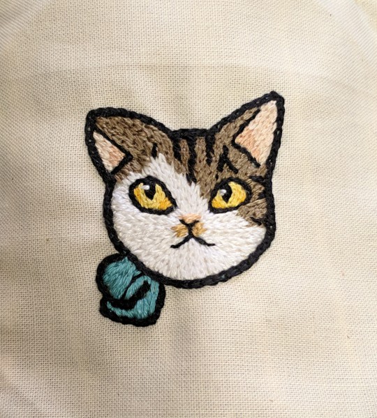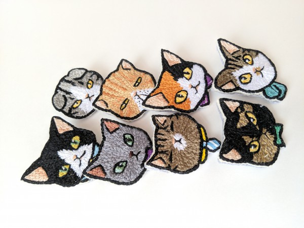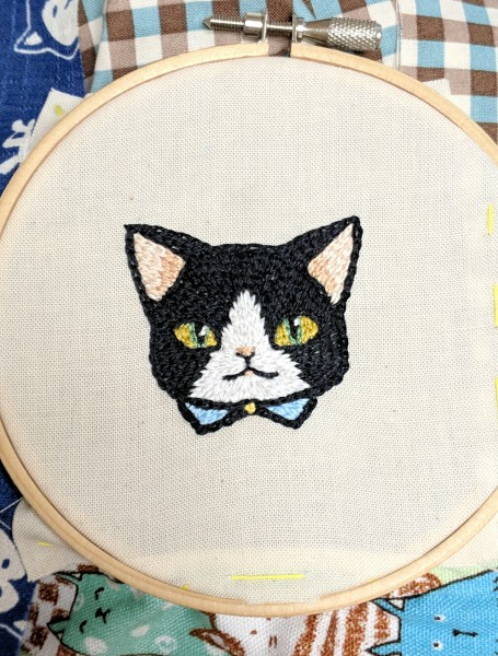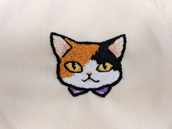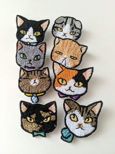 | 猫の刺繍をブローチに仕立てました。 色々な猫柄を刺繍したかったので、初めての試みでサビ猫も挑戦しました。 |