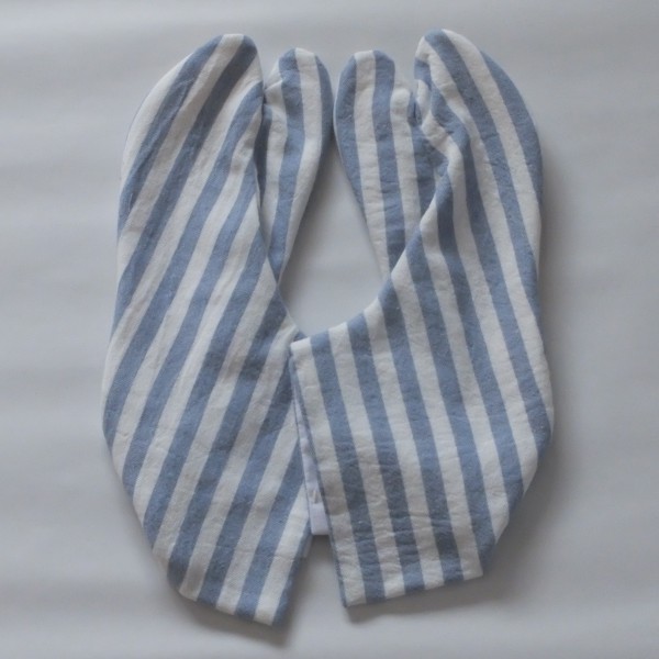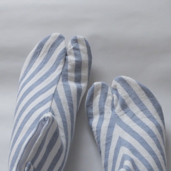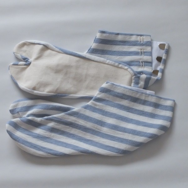 | 夏らしく、水色のストライプの生地を使った足袋。 4枚こはぜ、底布1枚仕立てです。 足の甲の柄合わせは特にしなかったのでズレていますが、せめて左右で揃えた方が可愛いんだろうなと思います。 木綿生地なので汗は吸ってくれると思いますが、底布が帆布なので夏には暑いかも。 綿麻の生地でも作ってみようと思います。 |