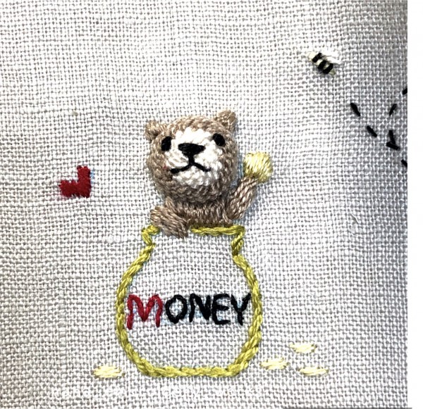 HoneyではなくMoney。という駄洒落でクマの立体刺繍をしました