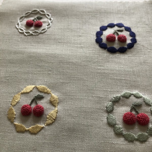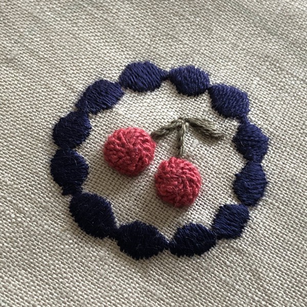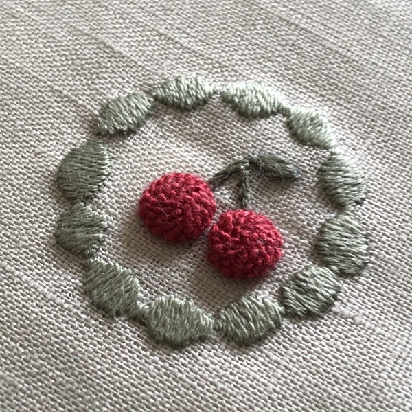 さくらんぼんの立体刺繍でくるみボタンのヘアゴムを作りました
