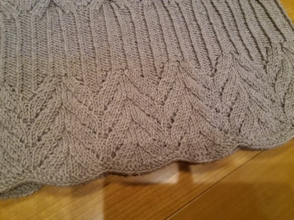 模様編みのセーターです。「クチュール・ニット11」の15を参考に、身頃の模様を少し変え、えりぐりをねじりゴム編みにしてあります。
