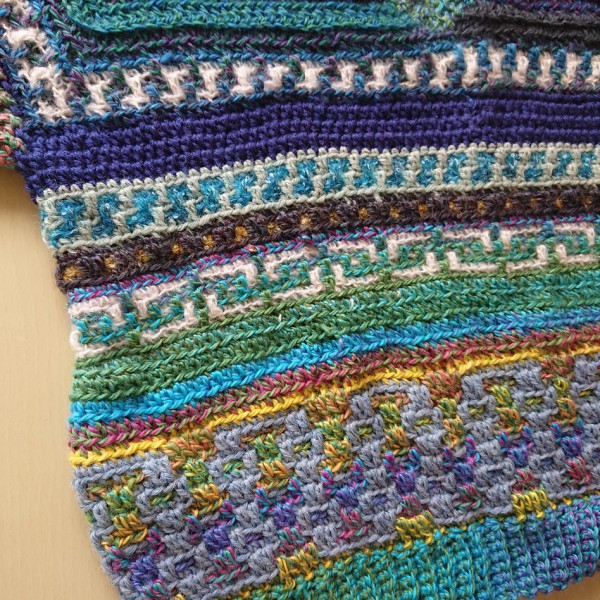 編んでから気づいたのですが、腰回りに使用した水色の糸はちょっと太かったようでそこだけ膨らんでしまいました