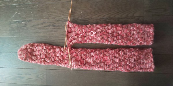 もう片方は、去年1度完成させたけれど、長くするために爪先の減らし目をほどいて編み足しします。