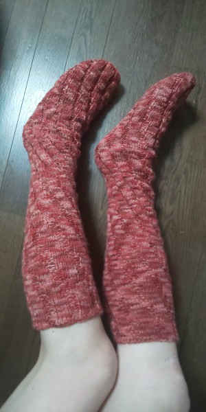 | 100均のウール100%毛糸で、スパイラルソックスを作成 かかとを編まないソックスなので、サイズ関係なく履けます |