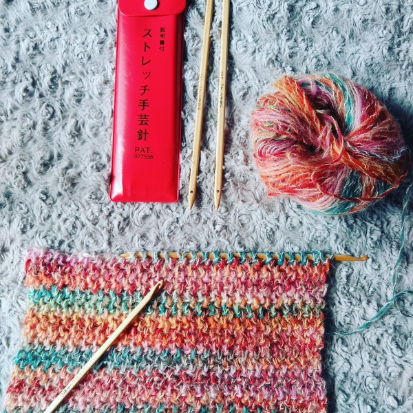 ストレッチ編みの練習をしています。何度も解いたり、糸を変えたりしてやっと形にできました。