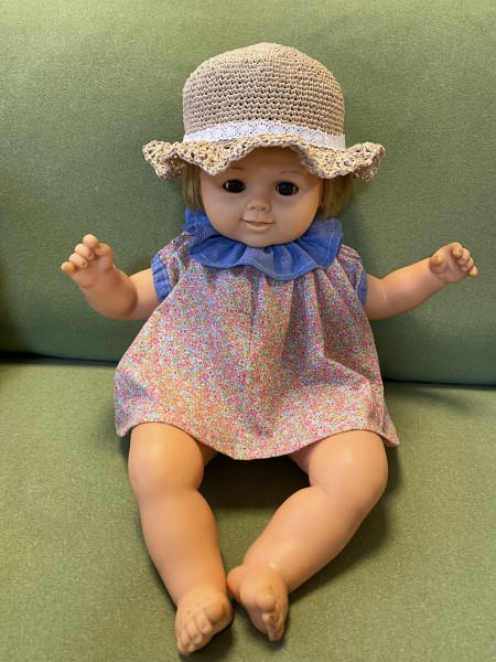 40数年前に実家にやって来たお人形のみかちゃん。新しく綿を詰め体を拭き髪を洗って綺麗にしました。洋服はベビー服からプルオーバーとスカパン&麦わら帽子を作りました。