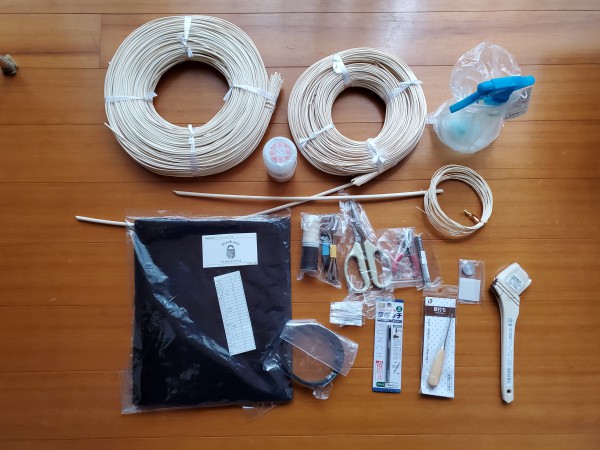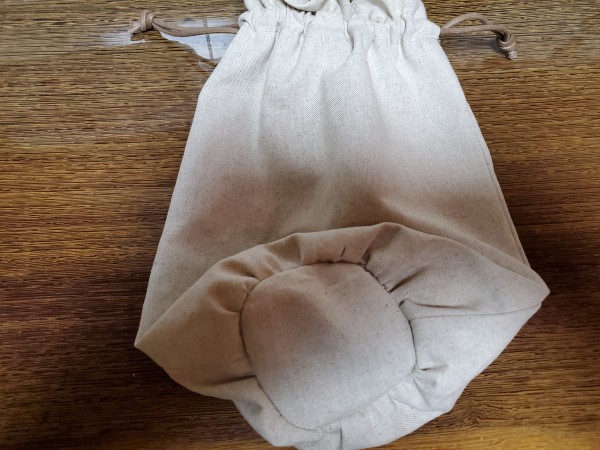 編み上がったのでコーヒーで染めて乾燥後、ニスを塗り、内布袋を作成