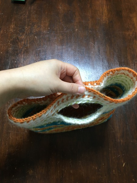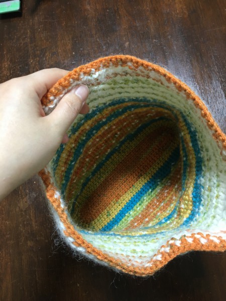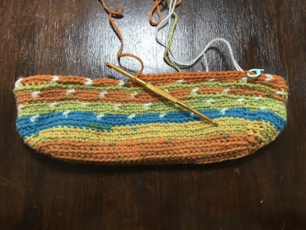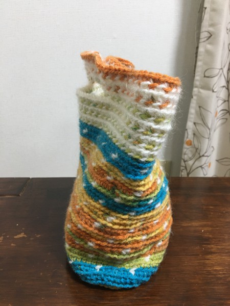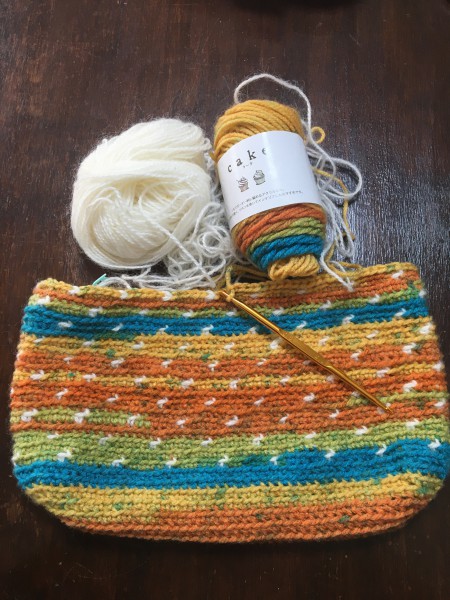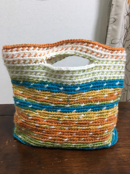 | トートバッグを作ります。 ポーチくらいの物を想像して作ってみたけど、幅が28cmあるので手持ちバッグでもいいぐらいの大きさになりそうです。 持ち手部分の色のバランスが分からなくて何度か編み直してみましたが、、 ん〜難しいですね。。 |