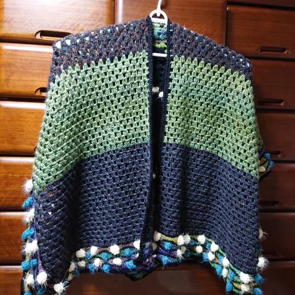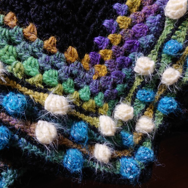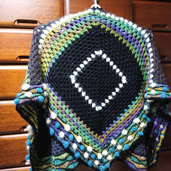 グラニースクエアで大きく四角く編んだ3枚をくっつけて、別の編み方で縁取り