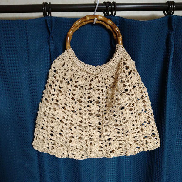 本に出ていた模様を自分好みにアレンジしました!竹のハンドルが使ってみたくて制作しました。和紙の糸なのでとっても軽いです。