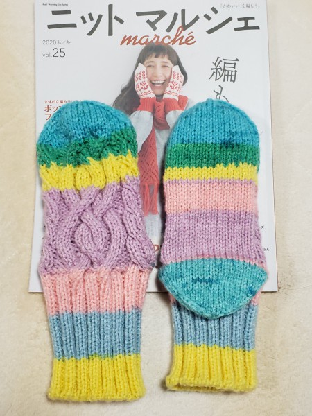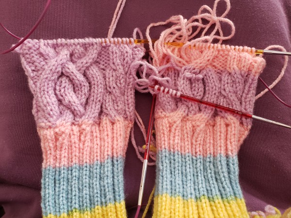 colorNO.21の黄色~水色~ピンク~紫色の2玉が終わり、それ以外に少し残っていたピンクと紫を使い、模様編み部分がほぼ終わり。