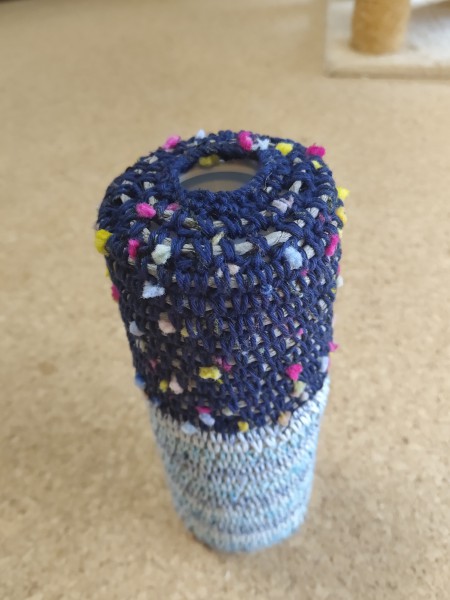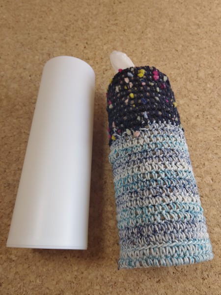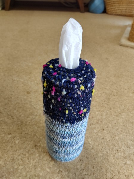 100均の縦型ティッシュケースに沿わせながら、100均の紙紐をコットン毛糸で細編みで巻き込んで編み上げました。