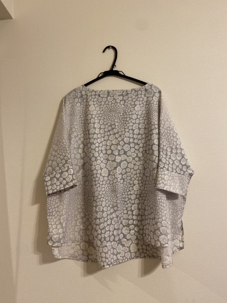 中野ユカリ「頼りになる大人服」よりドルマンブラウスをリバティ生地で作りました。テキスト通りだと丈が短くお尻が隠れないのが嫌なので、後ろを長めにし、前後差をつけたプルオーバータイプに変えました。カフスは初めてでしたが、こんなに簡単で素敵になるのかと感動しました。春にたくさん着たいです。