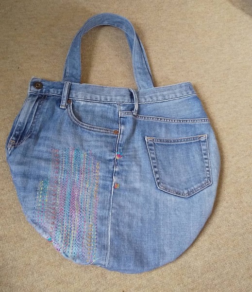 知人が大事にしていたジーンズをバッグにリメイクしました。傷んだ部分はダーニングや刺し子をしました。